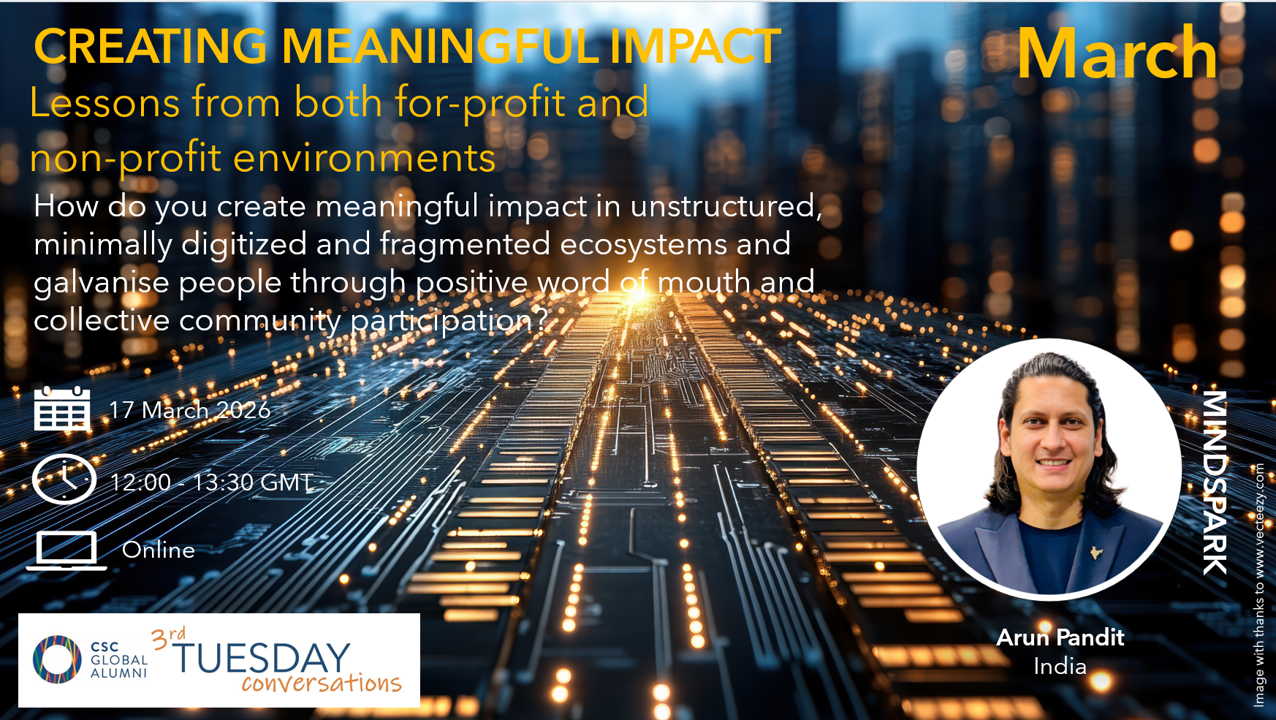 The CSC Global Alumni 3rd Tuesday Conversations are 90-minute monthly alumni conversation sessions hosted online. Each conversation is based on an important topic or area of interest. Held every 3rd Tuesday they are a space where alumni can all be students, practicing the leadership skills of listening without judgement, asking questions to more deeply understand, and sharing their thoughts to extend the knowledge and thinking of the broader community. Read more on our news page.